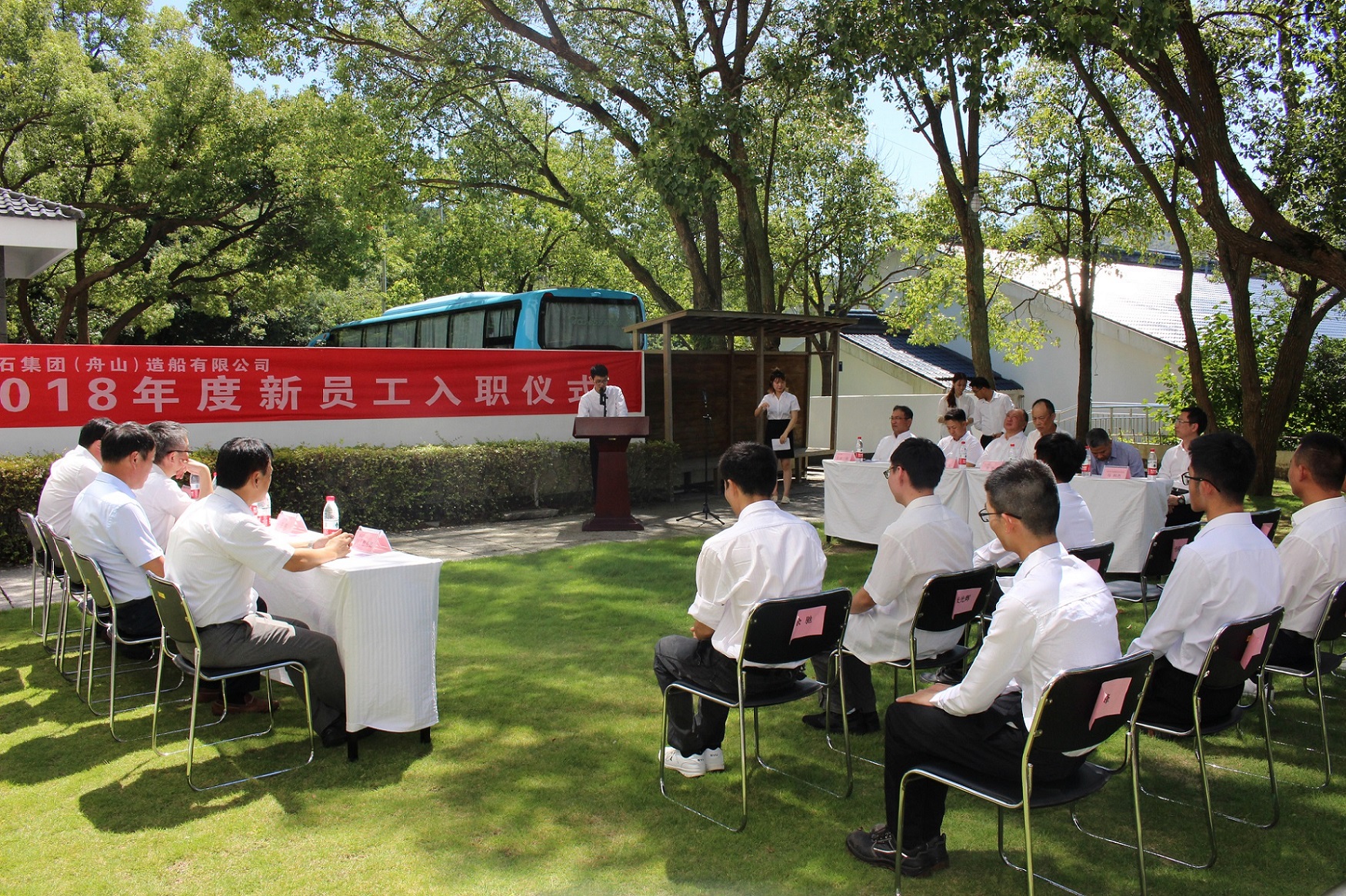 以浙江省舟山市為建造基地的常石集團(舟山)造船有限公司(所在地:中國浙江省舟山市岱山縣秀山鄉;總經理:佐騰二郎;以下簡稱:TZS)于8月31日在秀嶺山莊別館為15名新入職員工舉辦了2018年度入職儀式。